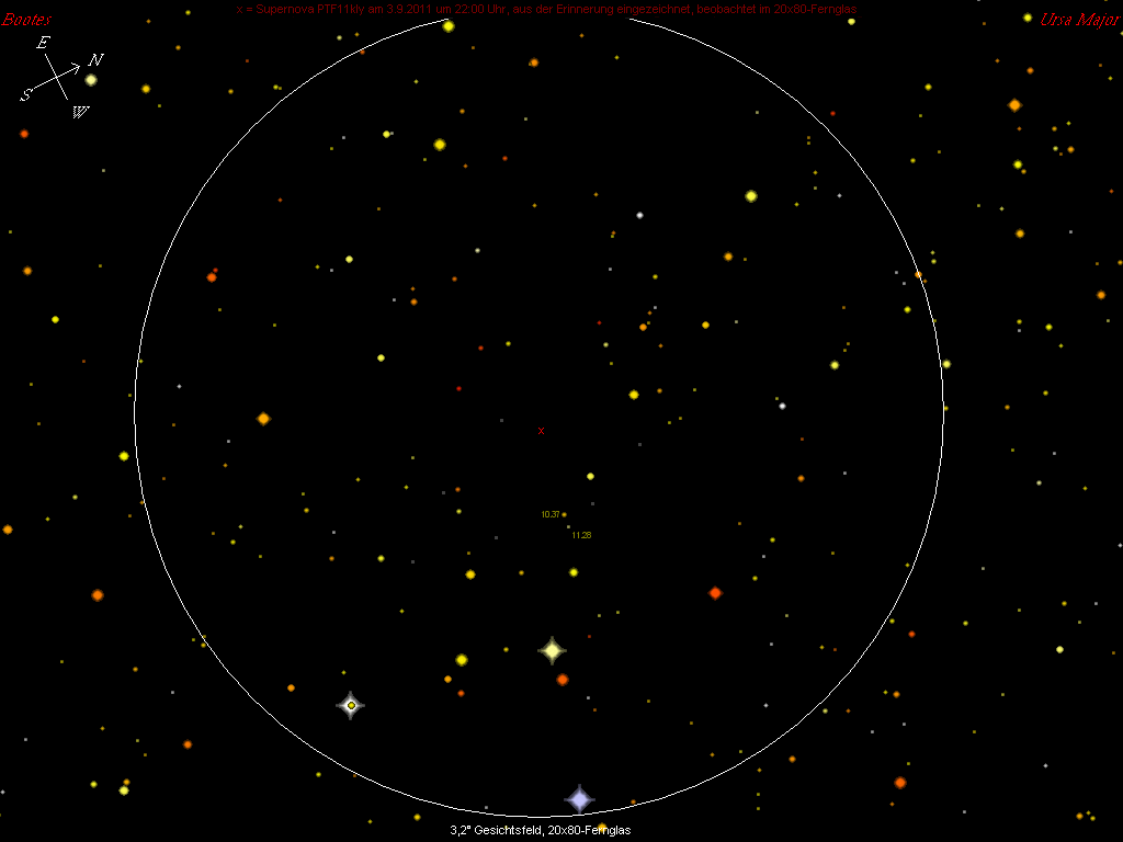 Nachtrag (11.9.2011): Die Supernova beobachte ich mit dem 20x80-Fernglas weiter