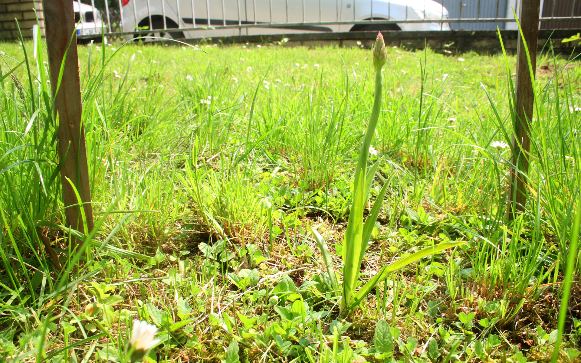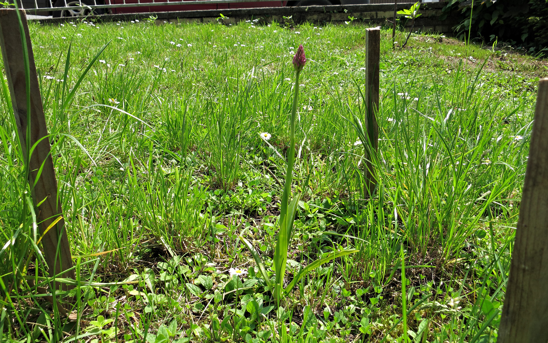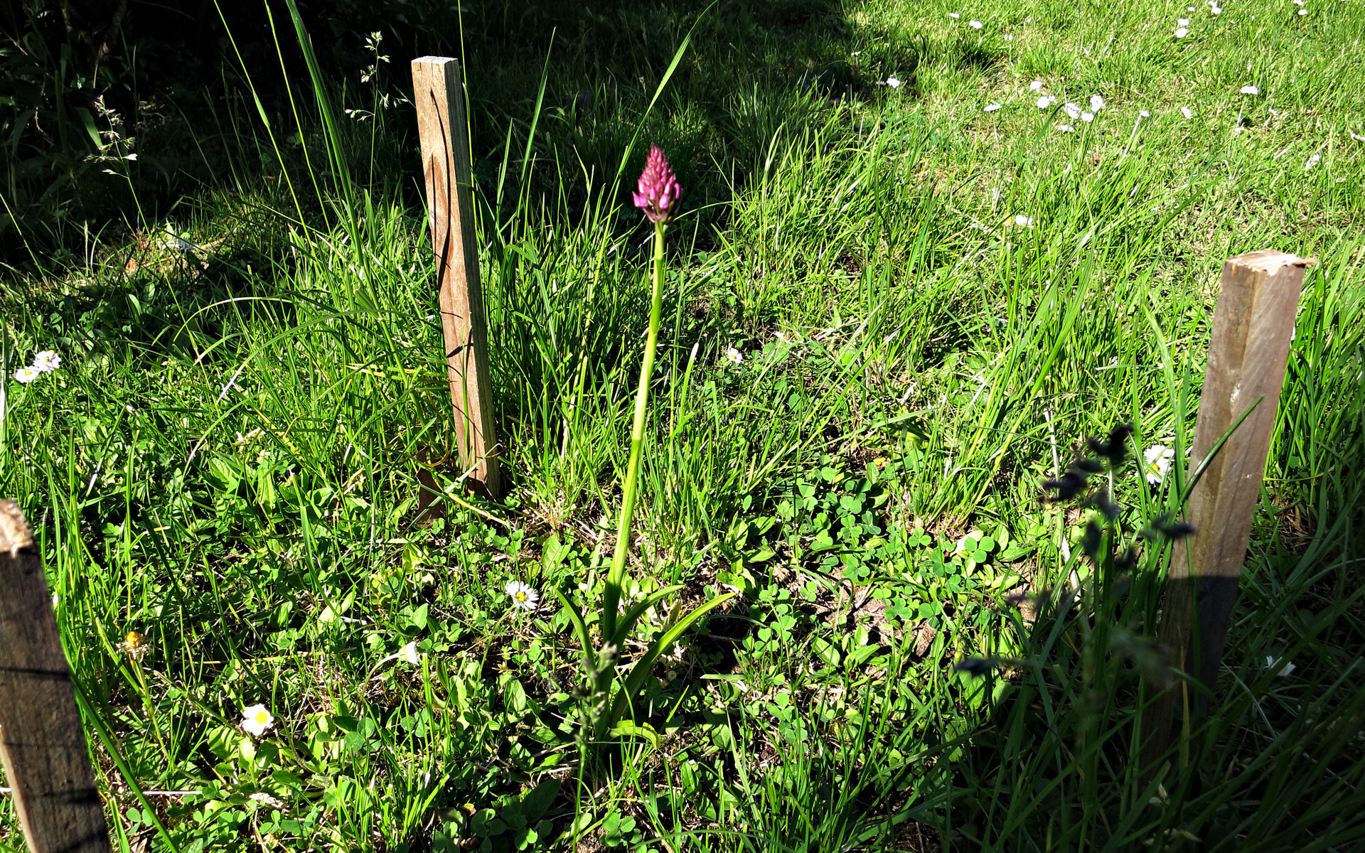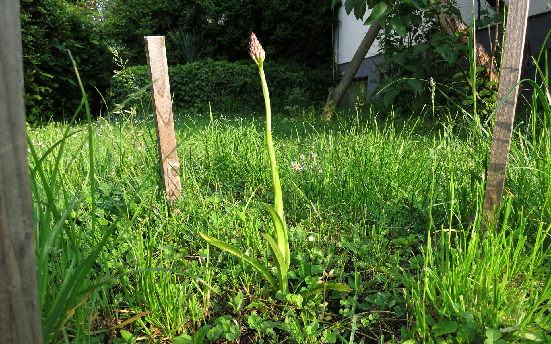 Die Orchidee hatte ich am 26. Mai des Dürresommers 2018 auf der Wiese des Vorgartens entdeckt und ihren Standort mit drei Holzstäben markiert. Im März/April des folgenden Jahres 2019 konnte ich diese unter Naturschutz stehenden Pflanze wiederfinden und ihre Entwicklung fotografisch dokumentieren. |