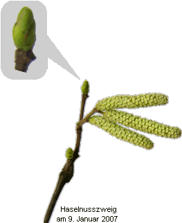 Und am 9. Januar 2007 sah ich zufällig am Wegesrand einen blühenden Haselnuss-Strauch