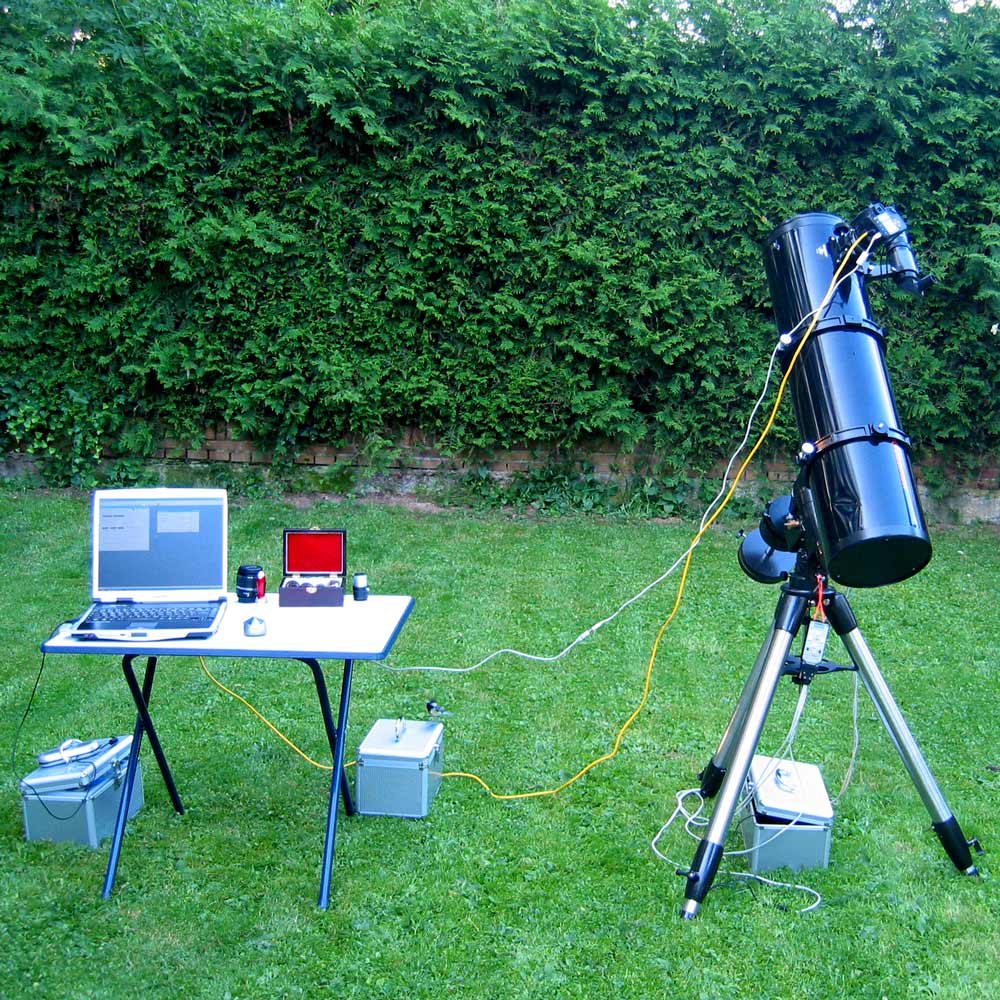 ![]() 200/1000-mm-Newton, Montierung "ADM", Steuerung MTS-3SLP, Canon 350D, Laptop (DSLRFocus). |