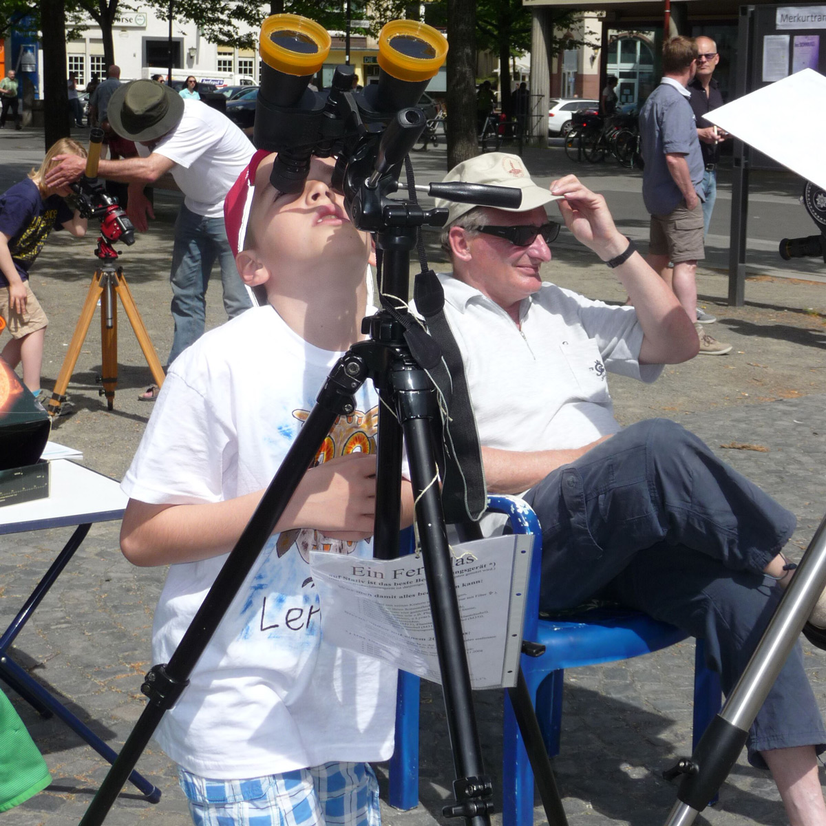 Prof. König am ETX, Dame mit ETX, Springer am Solarscope, Kinder vor dem ETX, Reporter am