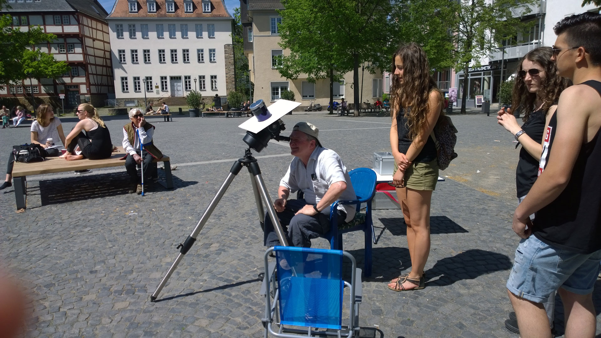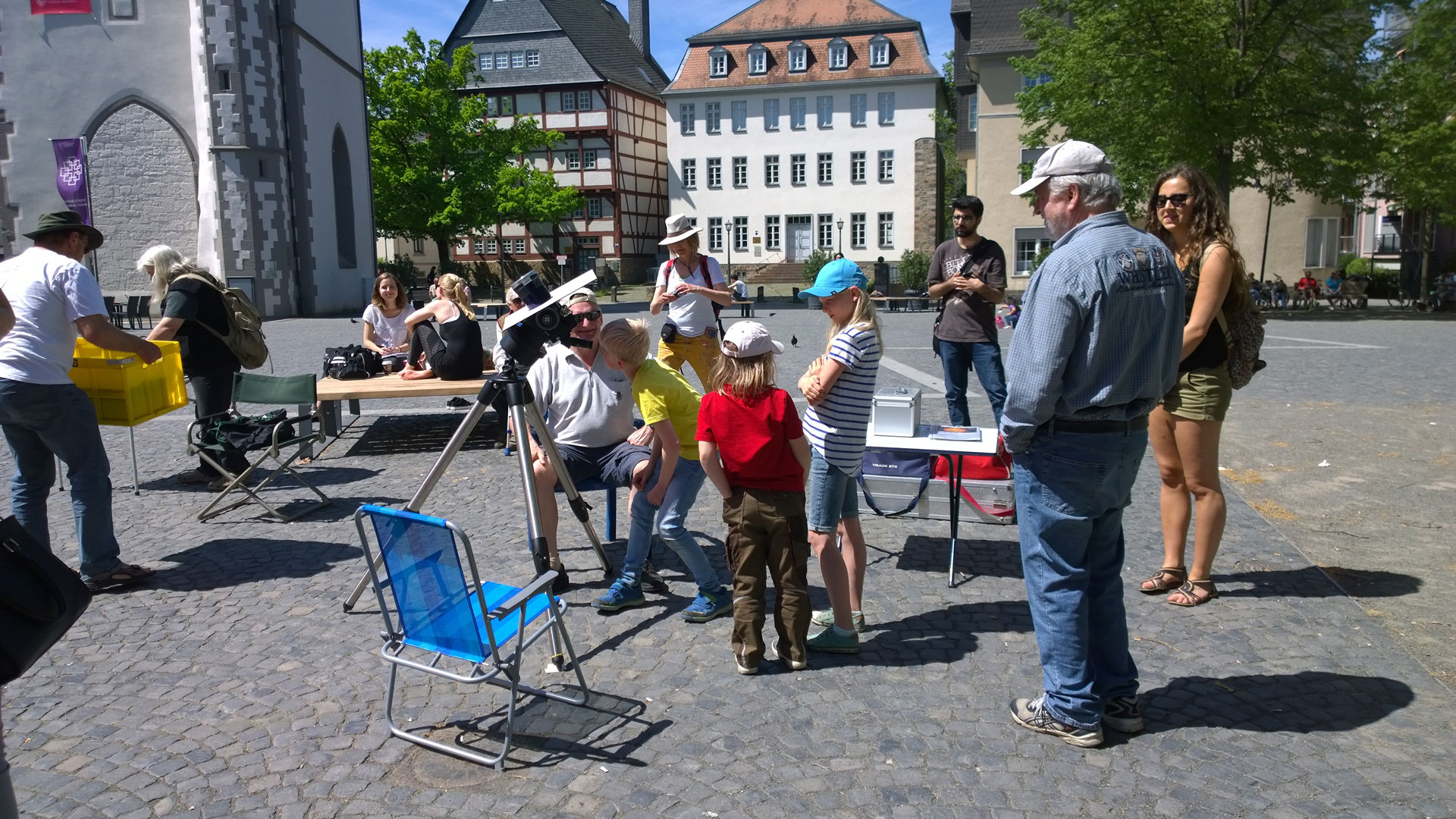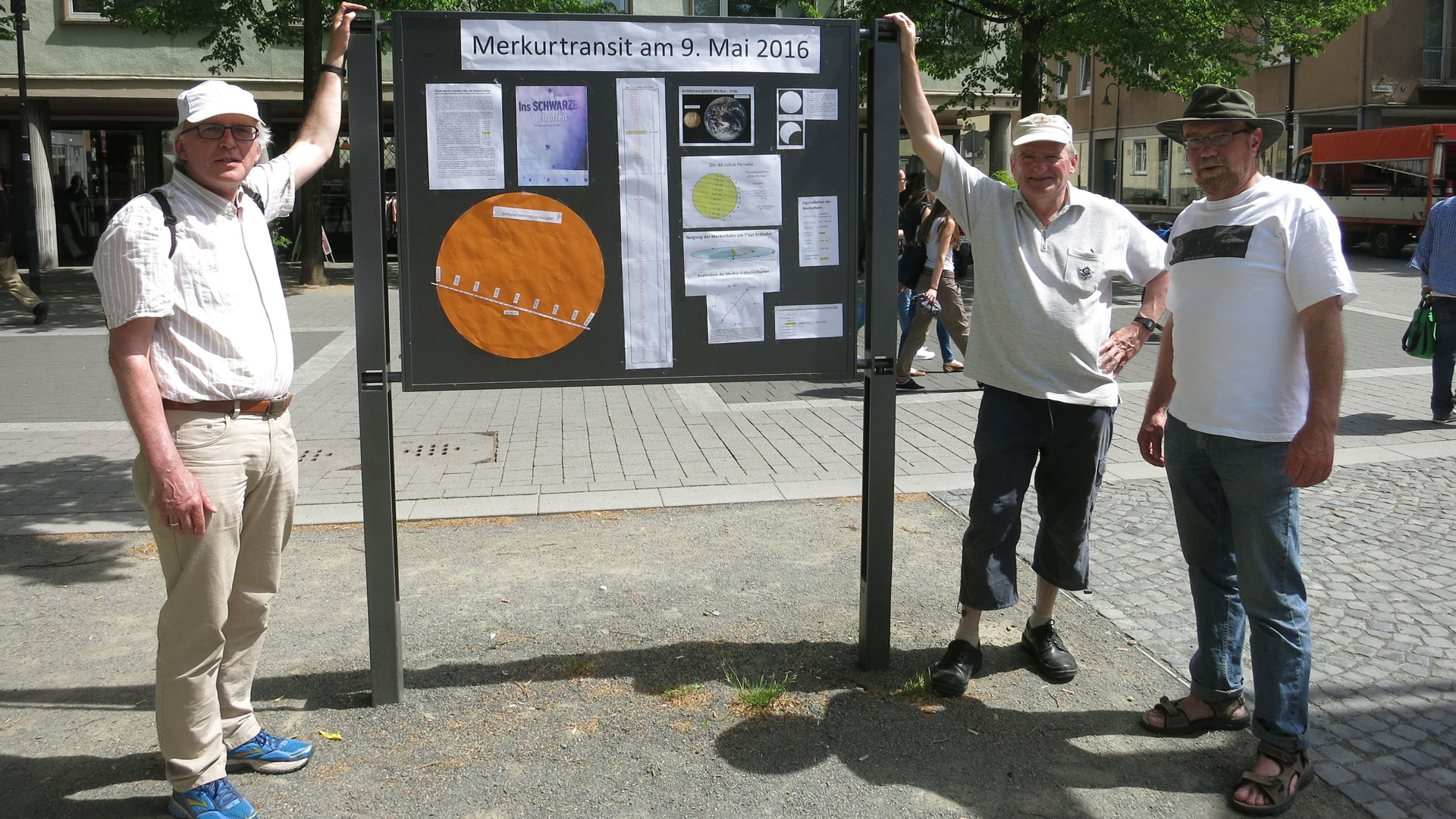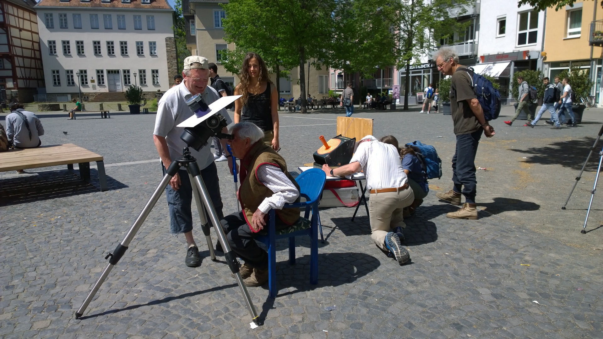Die drei Organisatoren der öffentlichen Beobachtung des Merkurdurchgangs Dr. Reiner Euler, Klaus Spruck und Josef Gräf (der Autor) hatten ein dankbares Publikum auf dem Gießener Kirchenplatz. Die Leute standen Schlange vor den Teleskopen und stellten mehr Fragen als die Experten beantworten konnten. Eine Besucherin gab sich als Mitarbeiterin eines schwedischen Planetariums zu erkennen. Niederländische, arabische und englische Stimmen sorgten für ein internationales Flair. Die sonnige Stimmung auf dem Platz erweckte den Eindruck eines Happenings: