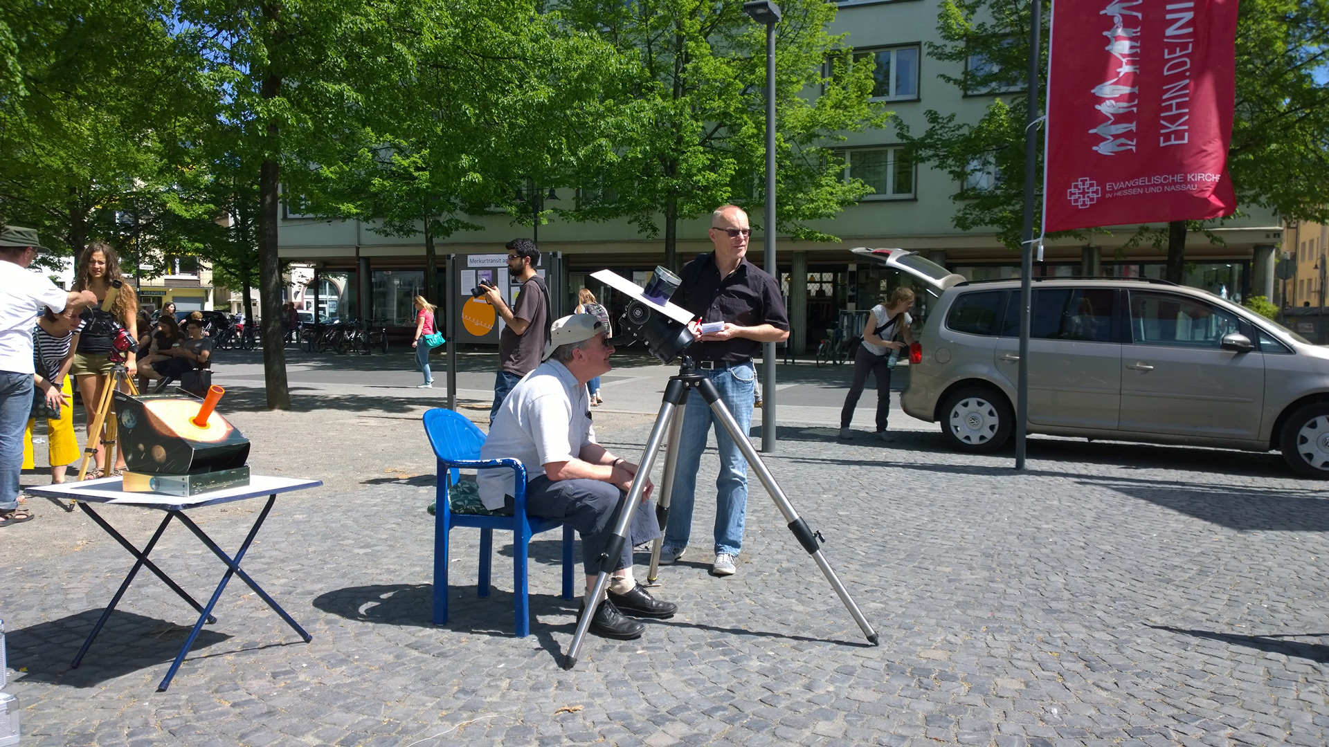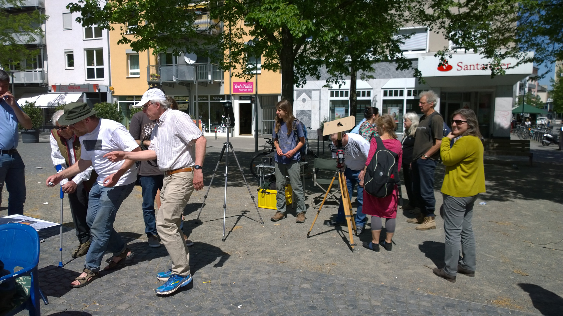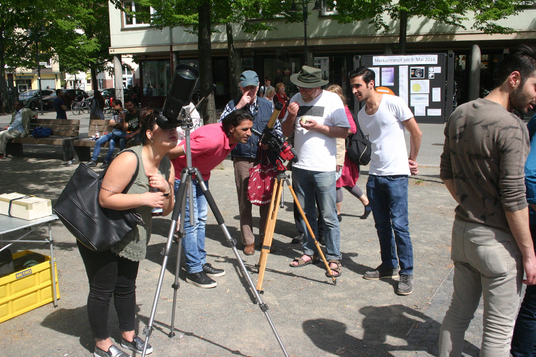 Die drei Organisatoren der öffentlichen Beobachtung des Merkurdurchgangs Dr. Reiner Euler, Klaus Spruck und Josef Gräf (der Autor) hatten ein dankbares Publikum auf dem Gießener Kirchenplatz. Die Leute standen Schlange vor den Teleskopen und stellten mehr Fragen als die Experten beantworten konnten. Eine Besucherin gab sich als Mitarbeiterin eines schwedischen Planetariums zu erkennen. Niederländische, arabische und englische Stimmen sorgten für ein internationales Flair. Die sonnige Stimmung auf dem Platz erweckte den Eindruck eines Happenings: