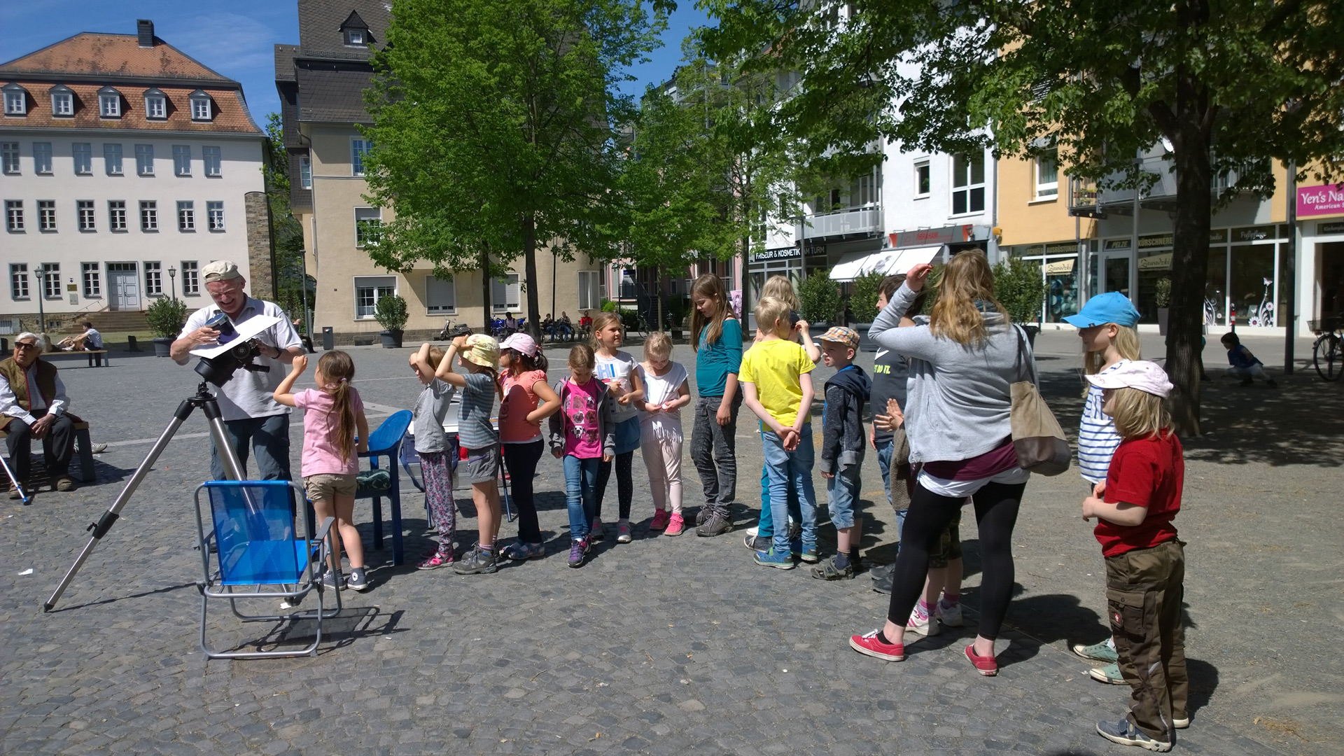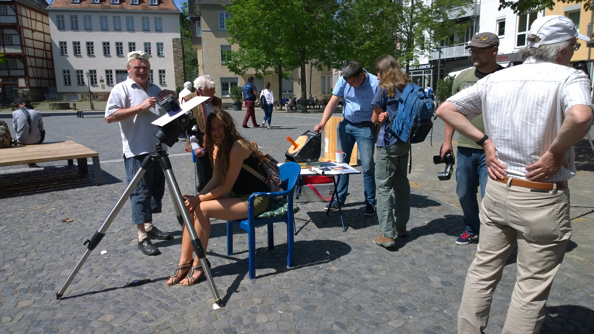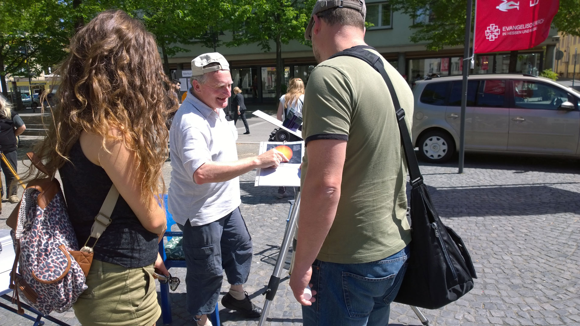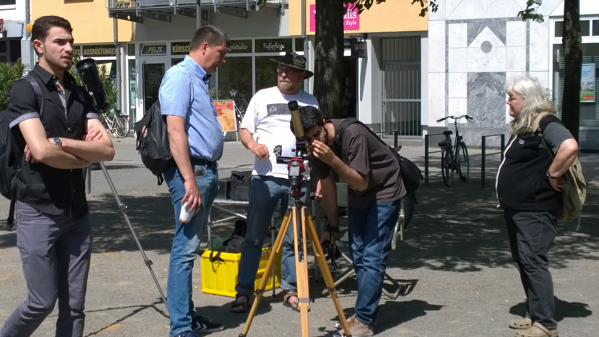 Die drei Organisatoren der öffentlichen Beobachtung des Merkurdurchgangs Dr. Reiner Euler, Klaus Spruck und Josef Gräf (der Autor) hatten ein dankbares Publikum auf dem Gießener Kirchenplatz. Die Leute standen Schlange vor den Teleskopen und stellten mehr Fragen als die Experten beantworten konnten. Eine Besucherin gab sich als Mitarbeiterin eines schwedischen Planetariums zu erkennen. Niederländische, arabische und englische Stimmen sorgten für ein internationales Flair. Die sonnige Stimmung auf dem Platz erweckte den Eindruck eines Happenings: