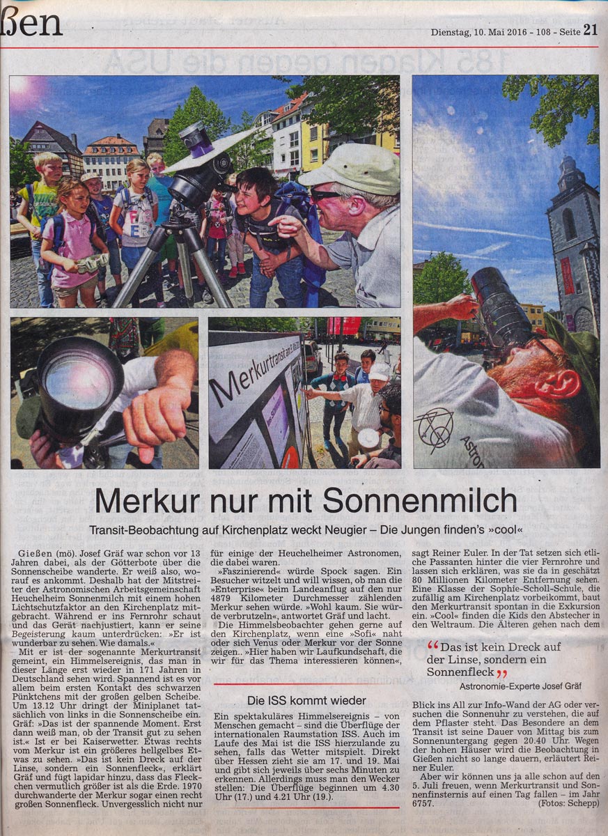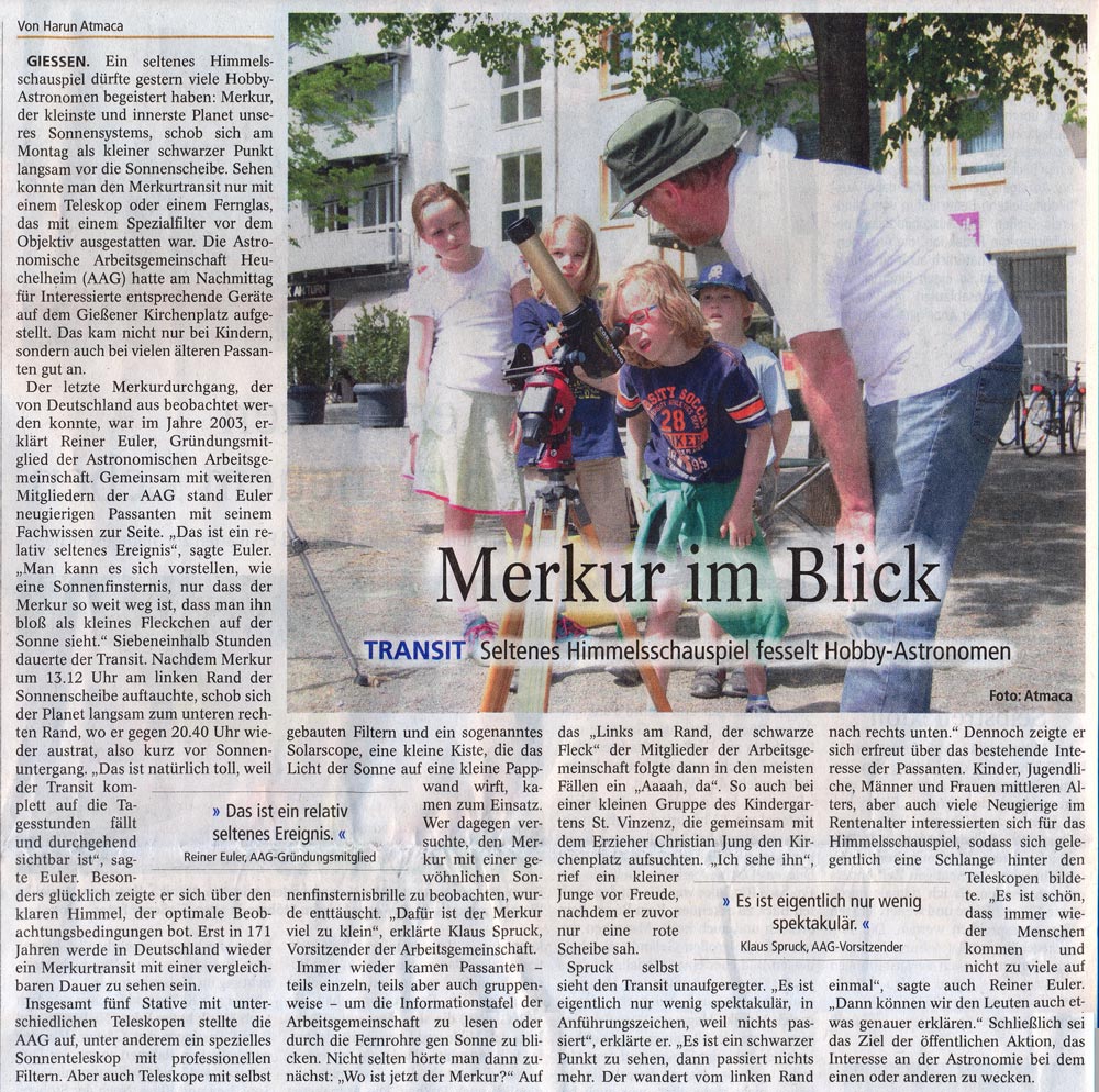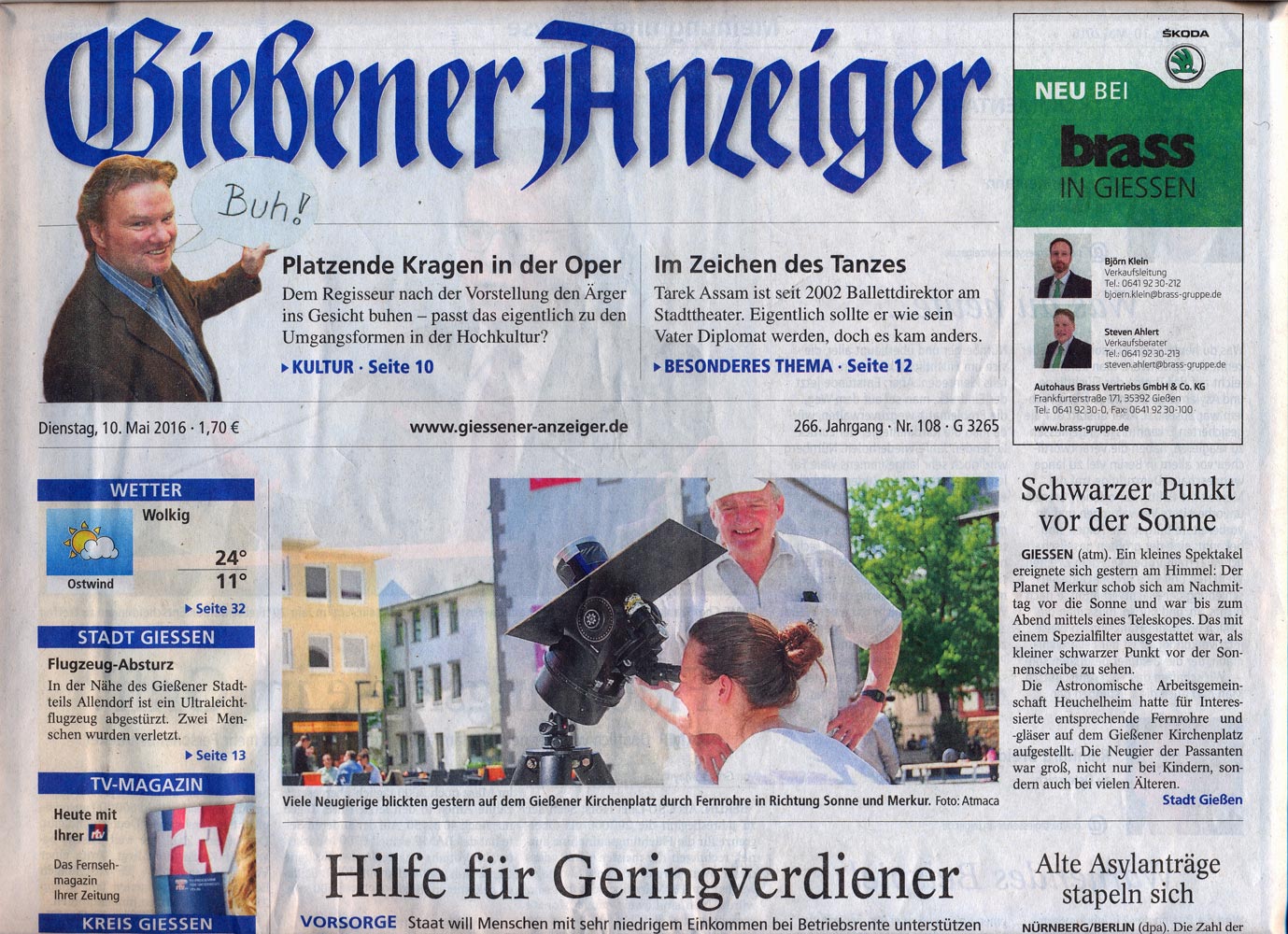 Gerade mal drei Tage nach dem Merkurtransit veröffentlichte die Gießener Allgemeine nebenstehende Grafik auf ihrer Titelseite.